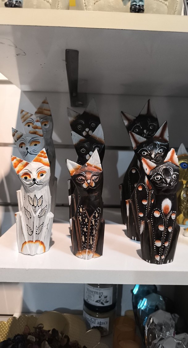 Çok renkli, el yapımı kedi figürleri, detaylı desenler ve ifade dolu yüzlerle süslenmiş.