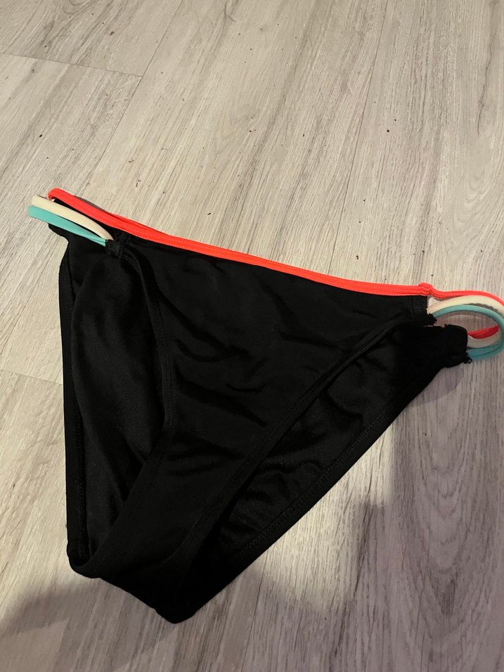 Bu kadın bikini altı, koyu renk kumaş ve çok renkli elastik bantları ile cesur ve athleisure tarzı sunar. Normal midi boyda ve askılı tasarımlıdır.