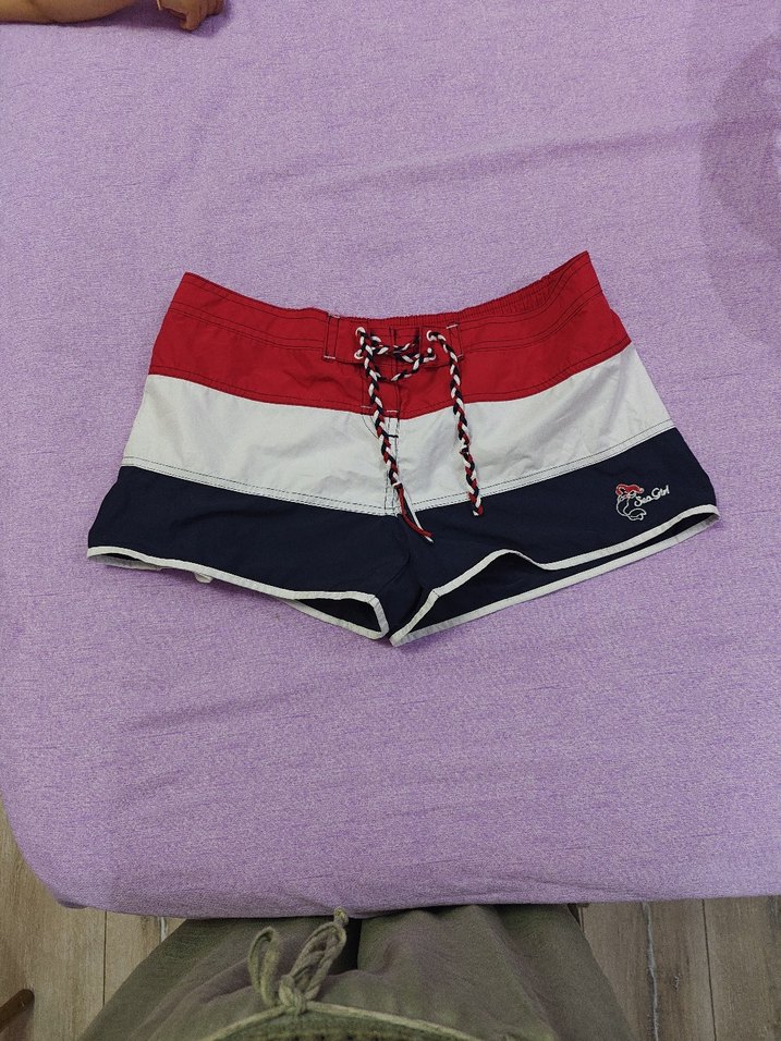 Elastik bel bantlı, çok renkli çizgili, dar kesim mini spor şort. Sokak stili ve plaj için uygundur. marka temsilidir