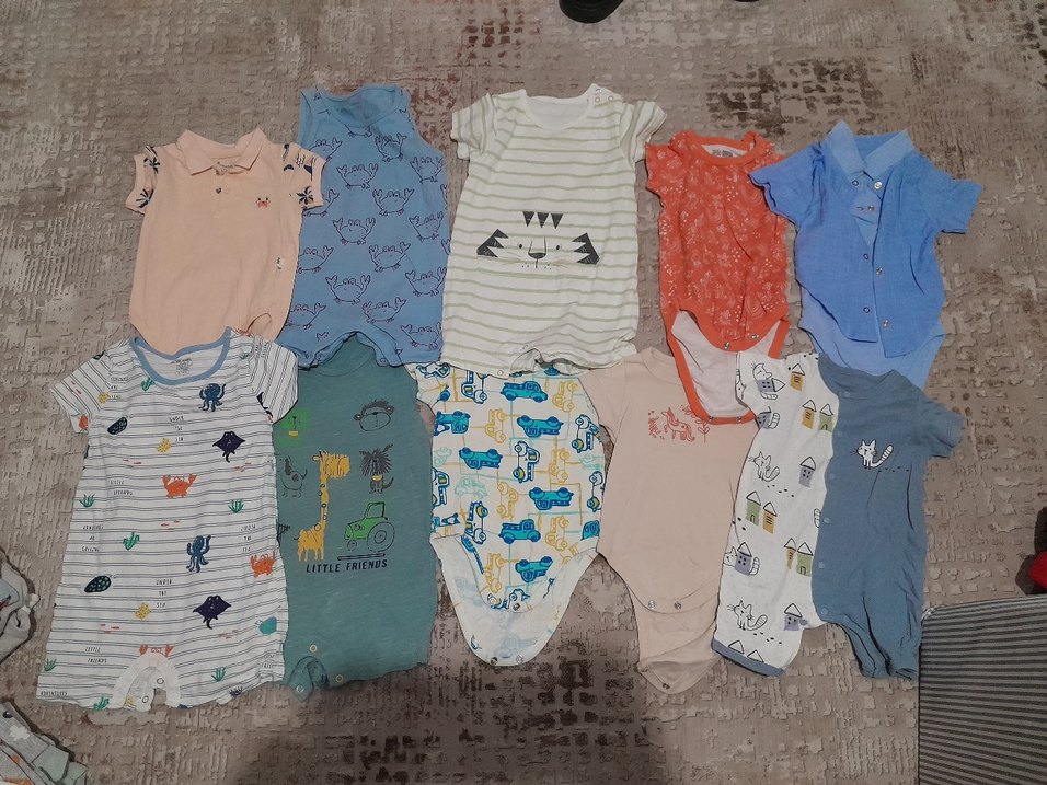 Pastel renklerde, kısa kollu, örme dokulu tekstil malzemeden yapılmış, çeşitli desenlere sahip, askısız yakalı erkek bebek body koleksiyonu.