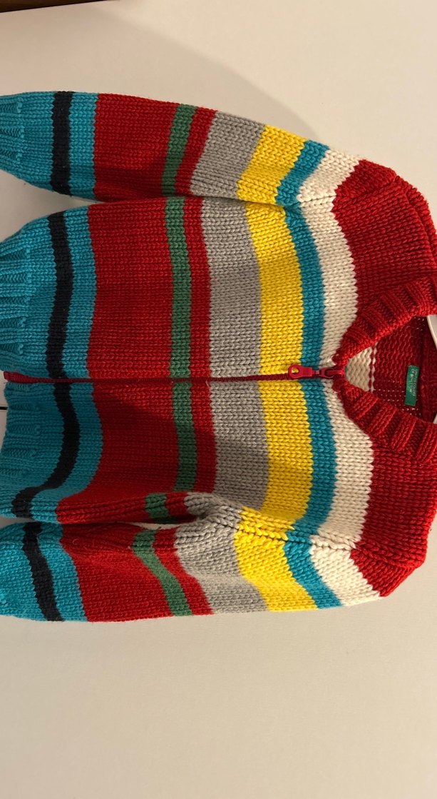 Fitted kesim, uzun kollu ve yuvarlak yakalı erkek çocuk örgü kazak, çok renkli ve bohem tarzda. Yaşı etikette yazmıyor tahmini 3- 4 yaşındaki çocuk giyebilir