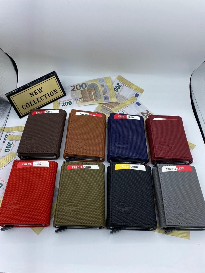 Çok renkli ve baskılı desenli erkek cüzdanı, kredi kartı bölmeleriyle iş ve sokak tarzına uygun. Üzerinde "200, NEW" yazısı bulunur.