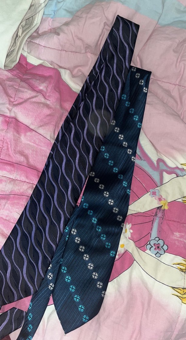 İki adet koyu renkli, çok renkli desenlere sahip erkek kravat seti. Biri dalgalı çizgiler, diğeri küçük geometrik şekiller içerir. İş yaşamına modern dokunuş.