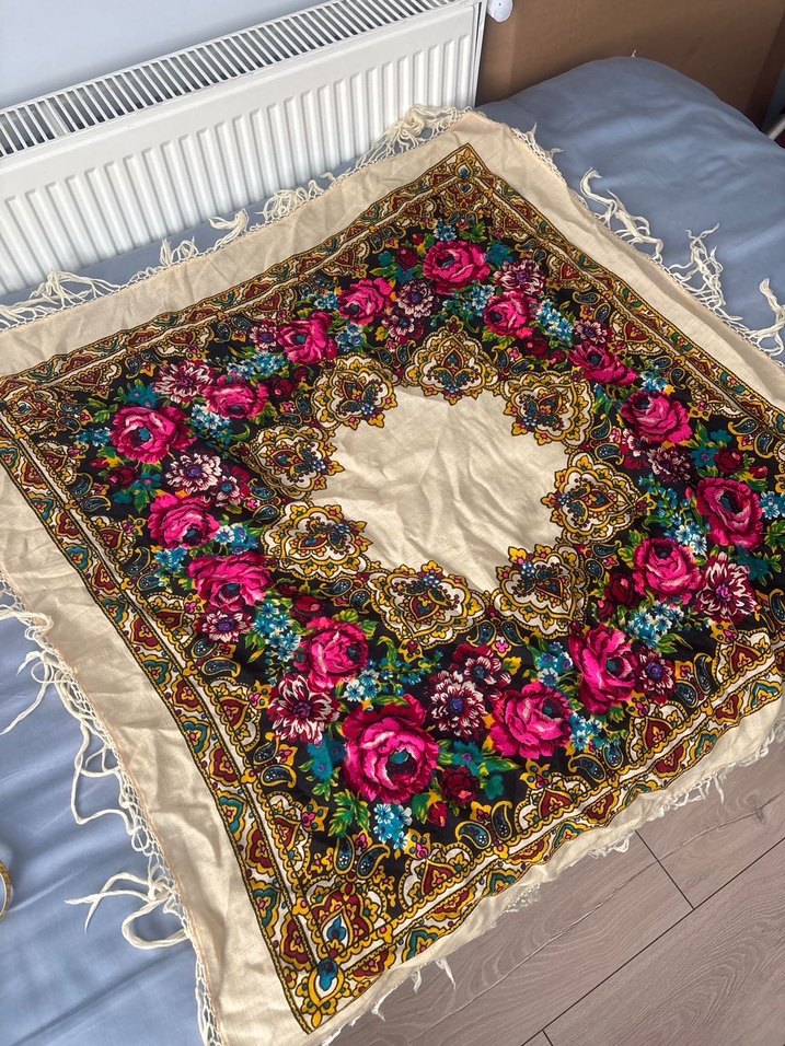 Kadınlar için çok renkli karanlık etnik ve çiçek desenli, fırfırlı kenarlara sahip yumuşak dokulu tekstil fular.