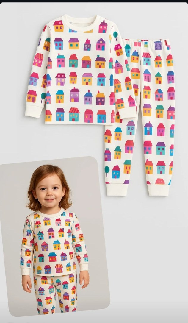 Yumuşak pamuktan yapılmış, çok renkli ev desenli, uzun kollu ve bisiklet yakalı kız pijama takımı. penye kumaştır rahat kullanım sağlar 3 yaş uyumludur #pijama #çocukgiyim