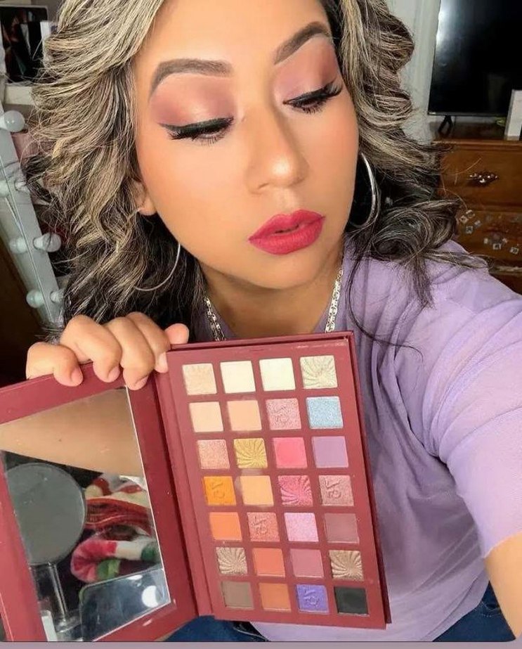 Çeşitli açık tonlarda çok renkli farlardan oluşan, içinde ayna bulunan far paleti.