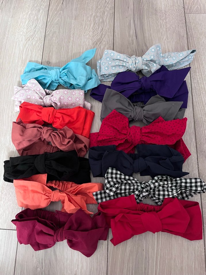 Bohem tarzda, koyu canlı renklerde, fiyonk detaylı çocuk saç bantları. Desensiz, sadece bir tane kareli desenli bant bulunur. Kareli olan da ufak bir leke vardır. Onun yerine birde içerisine hediye bir adet saç bantı konulacaktır. Adet fiyatı 85 tl dir. Toplu isteyene indirim yapılabilir.