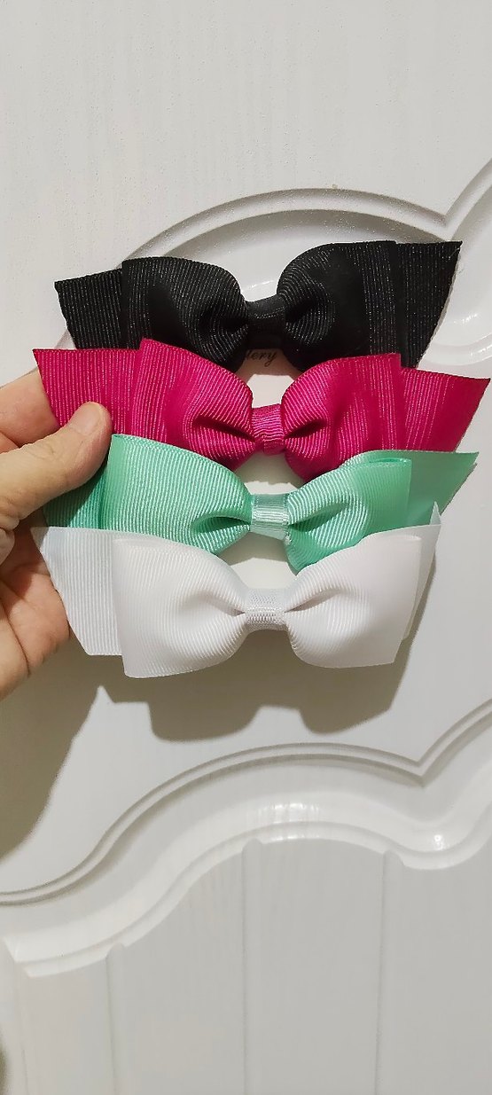 Siyah, pembe, nane ve beyaz renklerde fiyonk detaylı çok renkli saç tokaları seti. Çocuklar için sade ve kullanışlı.