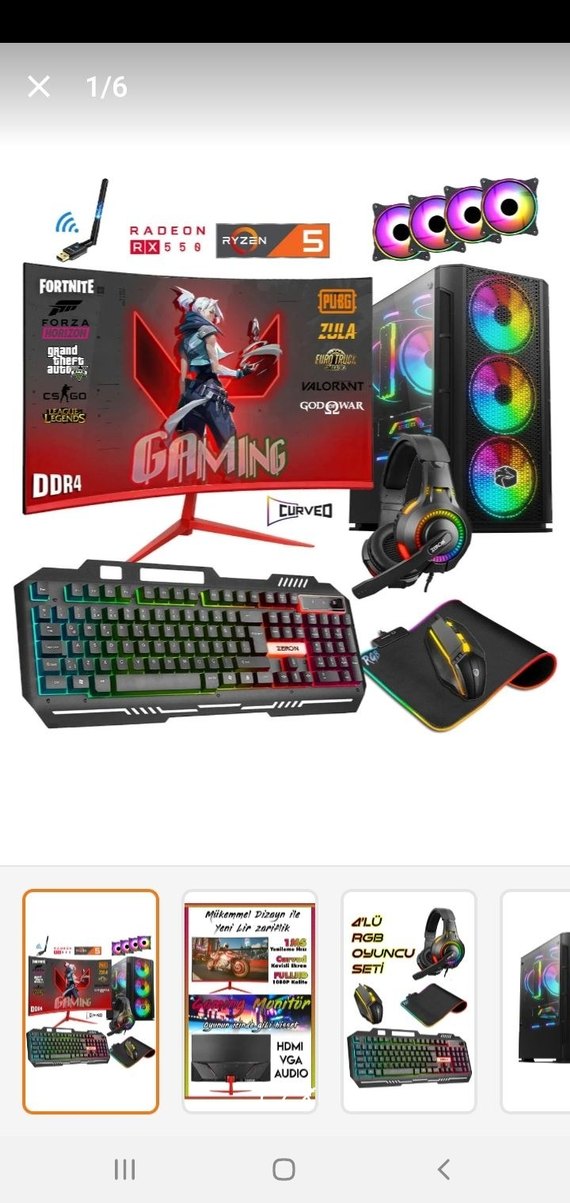 Çok renkli gaming masaüstü bilgisayar seti; kavisli monitör, RGB klavye, mouse ve mousepad, kulaklık ve RGB fanlı kasa içerir. Ryzen 5 ve Radeon RX 550 işlemci bulunur.