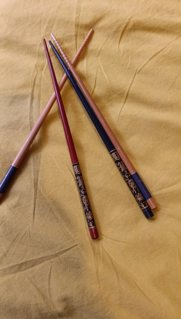 Koyu ve çok renkli, saplarında dekoratif desenler bulunan geleneksel Çin çubukları. Asya mutfağı için uygundur.