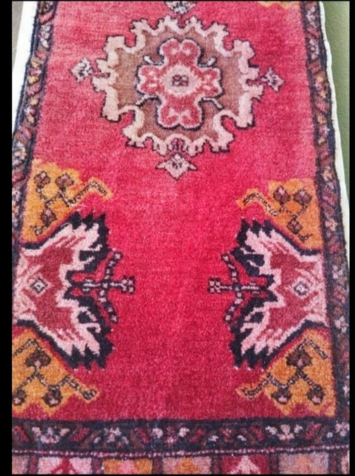 Koyu ve canlı çok renkli el dokuması yün halı kök boyası ile boyanmış yılların yorgunluğunun üzerinde taşıyan yıpranmaları ve renk atmaları mevcut olan seccade boy halı 1500 TL iadesi yoktur bakarak alınız