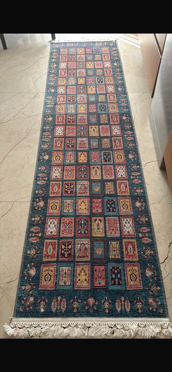Koyu çok renkli kare desenleri ve zengin yeşil kenarlarıyla geleneksel motifler barındıran halı. Tüysüz ince eni 80 boyu 3 metre
