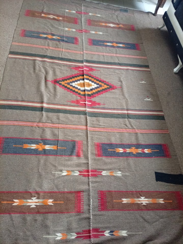 Kahve rengi zemin üzerine çok renkli geometrik desenler içeren geleneksel tarzda bir kilimdir.