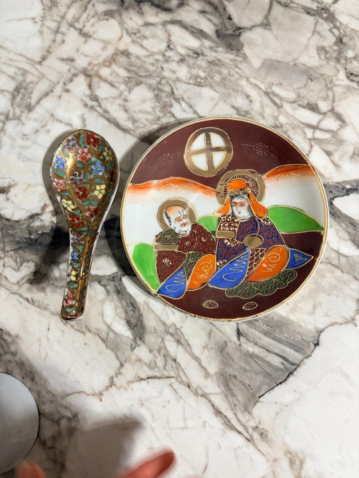 Canlı renklerde, geleneksel desenli tabak ve kaşık seti. Tabakta kültürel sahne detayları yer alır. ️