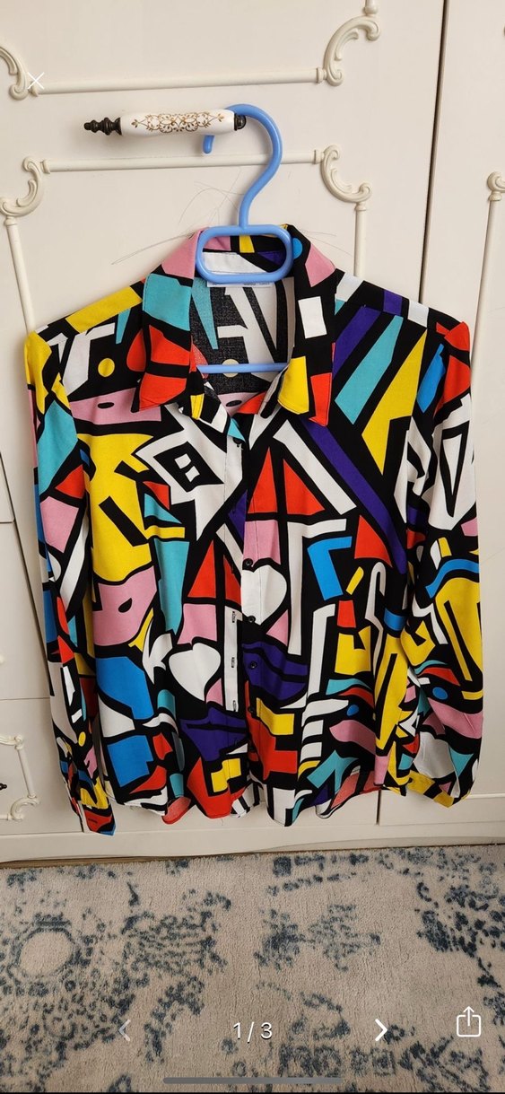 Kadın gömlek, bol kesim, uzun kollu ve V yaka. Sentetik kumaştan, renkli geometrik baskılı, günlük kullanım ve sokak stiline uygun.