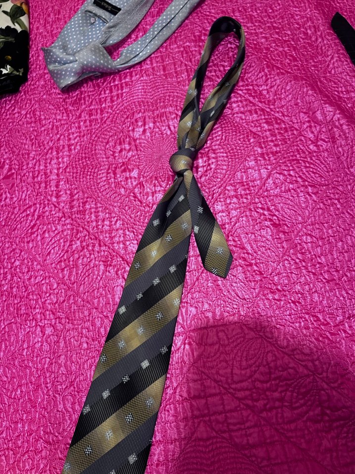 Küçük geometrik detaylara sahip koyu çok renkli çizgili desenli, gotik tarzda Parisli dokunuşlu erkek kravatı.