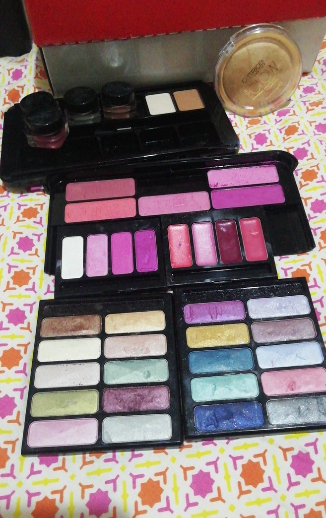 Çeşitli tonlarda koyu ve canlı renkler içeren çok renkli göz farı paleti.