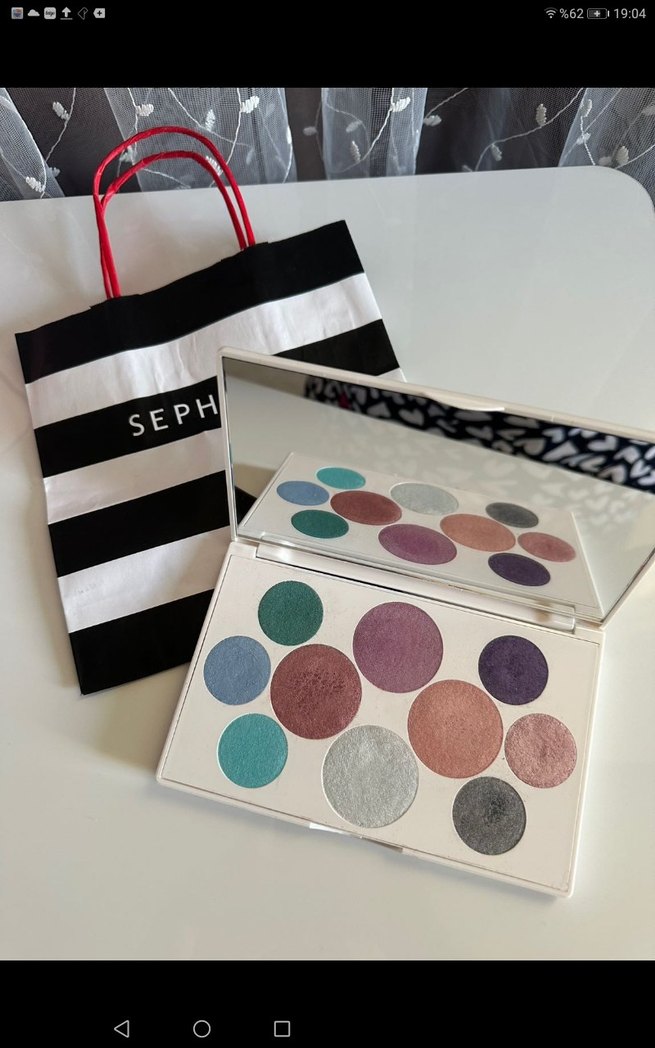 Çok renkli ve açık tonlarda göz farı paleti, içinde ayna ve Sephora marka çanta ile birlikte. sephora mağazasından almıştım