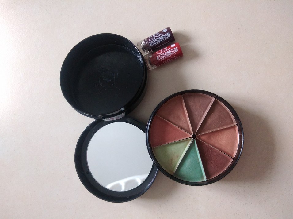 Hediyeli.. Yuvarlak göz farı paletinde koyu ve haki tonlar ile iki küçük ruj bulunur. Paletin içinde ayna mevcuttur. Rujlar sıfır kullanılmamış.. Farda bir kaç sefer kullanıldı.. Ruhların numaralari üzerinde yazıyor.. En sondaki ruju hediye olarak gönderecem. Kapağı yoktur..