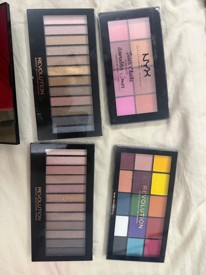 Revolution ve NYX markalarına ait çok renkli göz farı paletleri, koyu ve canlı tonlar içerir. Fiyat sorun tek adet