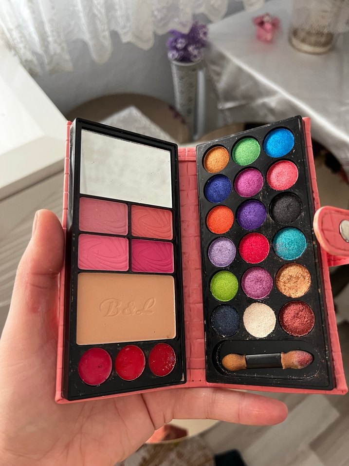 Canlı renklerde göz farları, allık, rujlar ve aplikatörlü aynadan oluşan kompakt makyaj paleti.