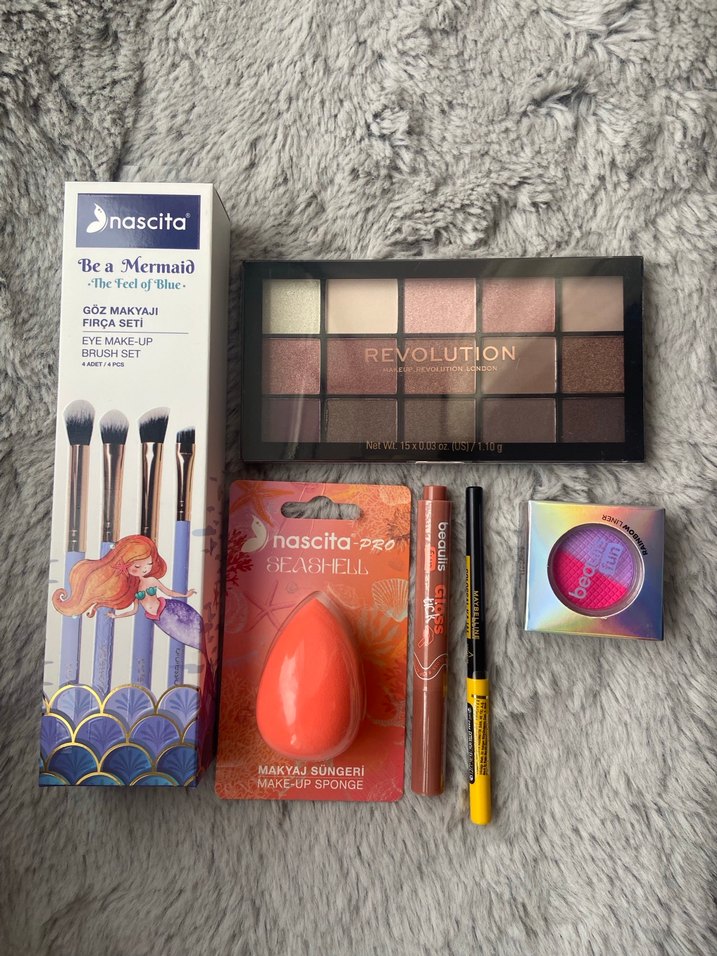 Çok renkli göz farı paleti, makyaj süngeri, göz ve eyeliner ürünleri ile Nascita'dan göz makyaj fırçaları içeren makyaj seti. Canlı açık renk tonları sunar. Ürünler sıfırdır (stok amaçlı fazla almıştım)
