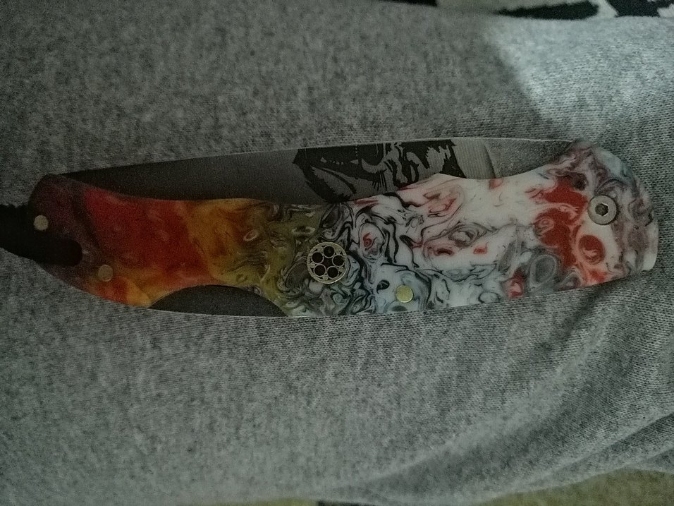 Çok renkli, gri tonların hakim olduğu, benzersiz mermer desenli kesici bıçağı kurt desenlidir.