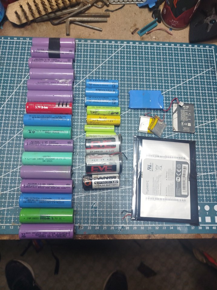 Güç bankası yapımı veya tamiri için çok renkli, farklı boyutlarda şarjlı piller kesme matı üzerinde düzenlenmiş.