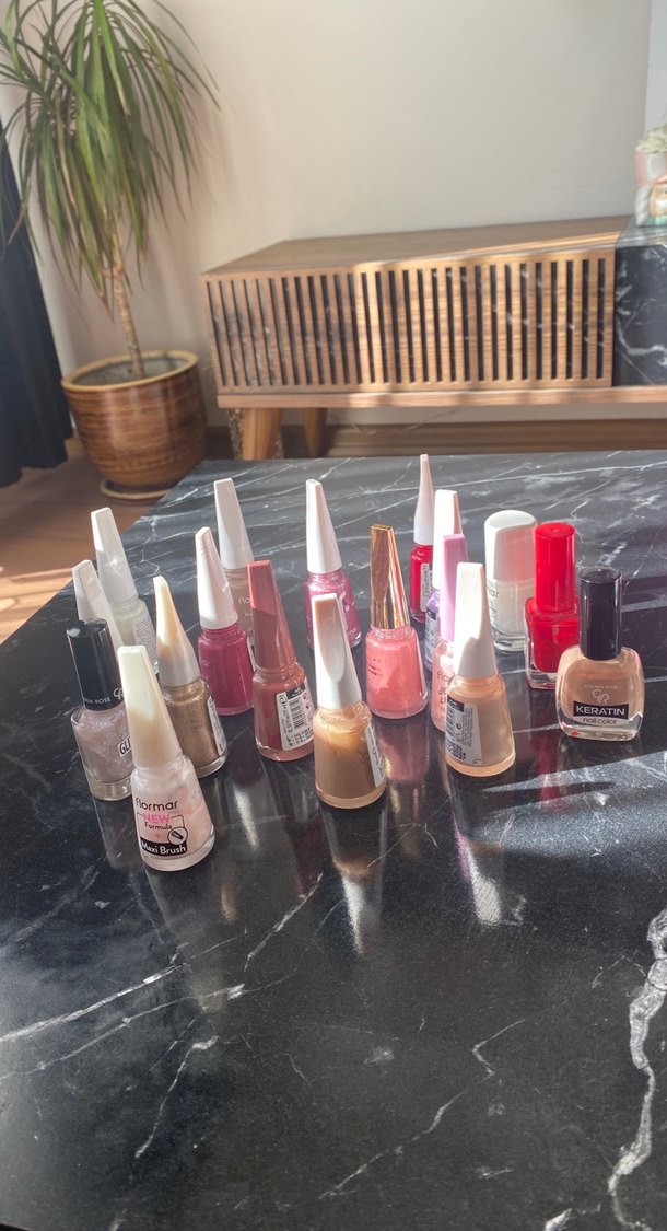 Çeşitli hafif tonlarda ve farklı kaplamalarda çok renkli tırnak cilası seti.