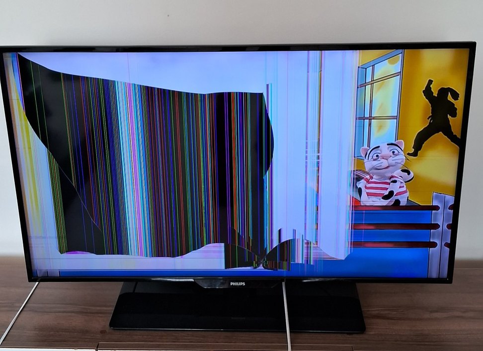 Çok renkli hasarlı Philips monitör, dikey çizgiler ve siyah lekelerle kırık ekran gösteriyor. Ekran kullanılamaz durumda.