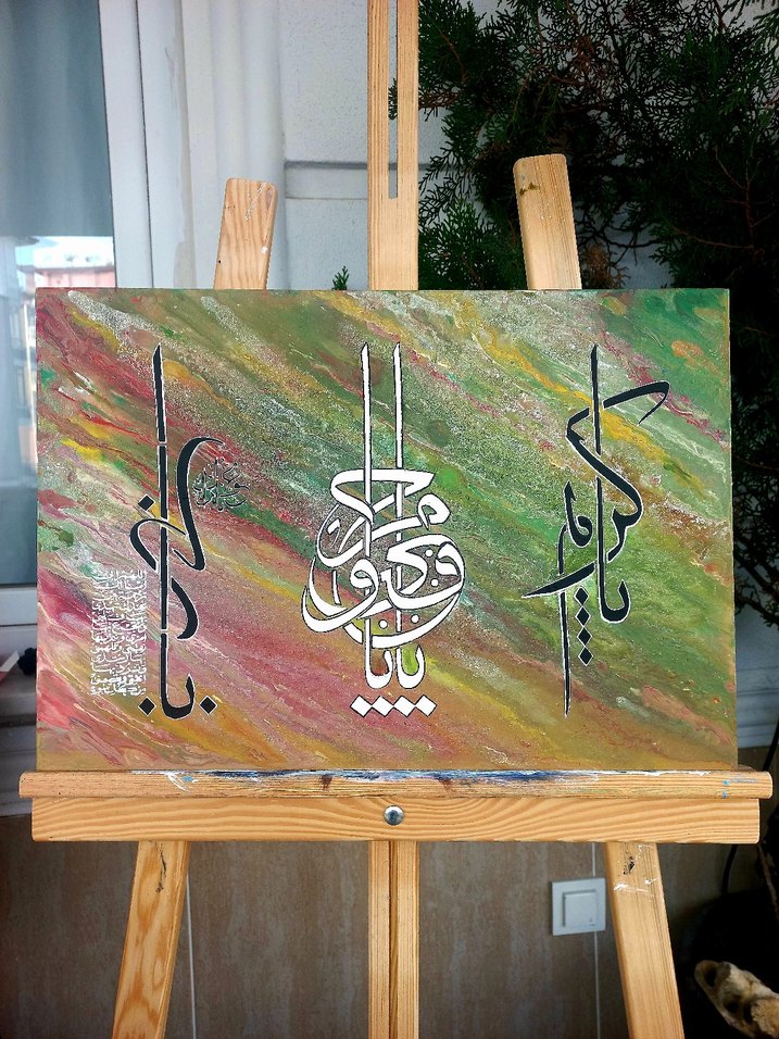 çok renkli soyut arka plan üzerinde detaylı Arap hat sanatı bulunan tablo. Elif, Ya Vedud, Ya Kerim yazmaktadır. 35*50 ebadında.