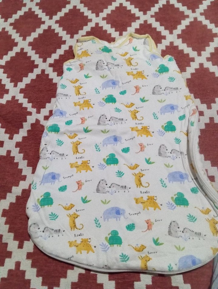 Renkli hayvan desenleriyle süslenmiş, yumuşak pamuklu kumaştan yapılmış bebek uyku tulumu, bebeğin uyurken rahat etmesini sağlar.