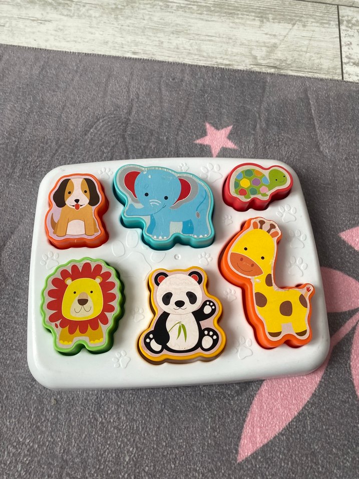 Bu eğitici oyuncakta köpek, fil, tırtıl, aslan, panda ve zürafa gibi çok renkli hayvan figürleri beyaz bir taban üzerinde yer alıyor, oyunla öğrenmeyi destekler .