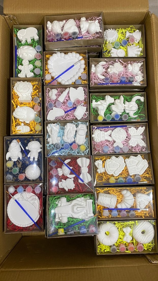 Çok sayıda beyaz alçı figür ve şekil, küçük boya kutuları ve fırçalar içeren yaratıcı hobi ve boyama seti. adet fiyatıdır