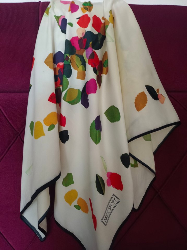 İpek görünümlü, drapeli kadın fular, canlı çok renkli desenlere sahip. Bohem, hippie ve retro esintili, çağdaş Paris tarzını yansıtıyor. Hafif renk paletinde, siyah kenarlıklıdır.