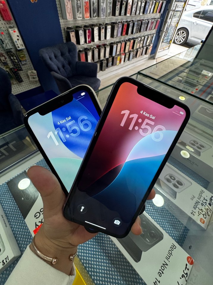 Elde tutulan iki iPhone, canlı çok renkli koyu tonlarda ekranlarıyla 11:56 saatini gösteriyor.