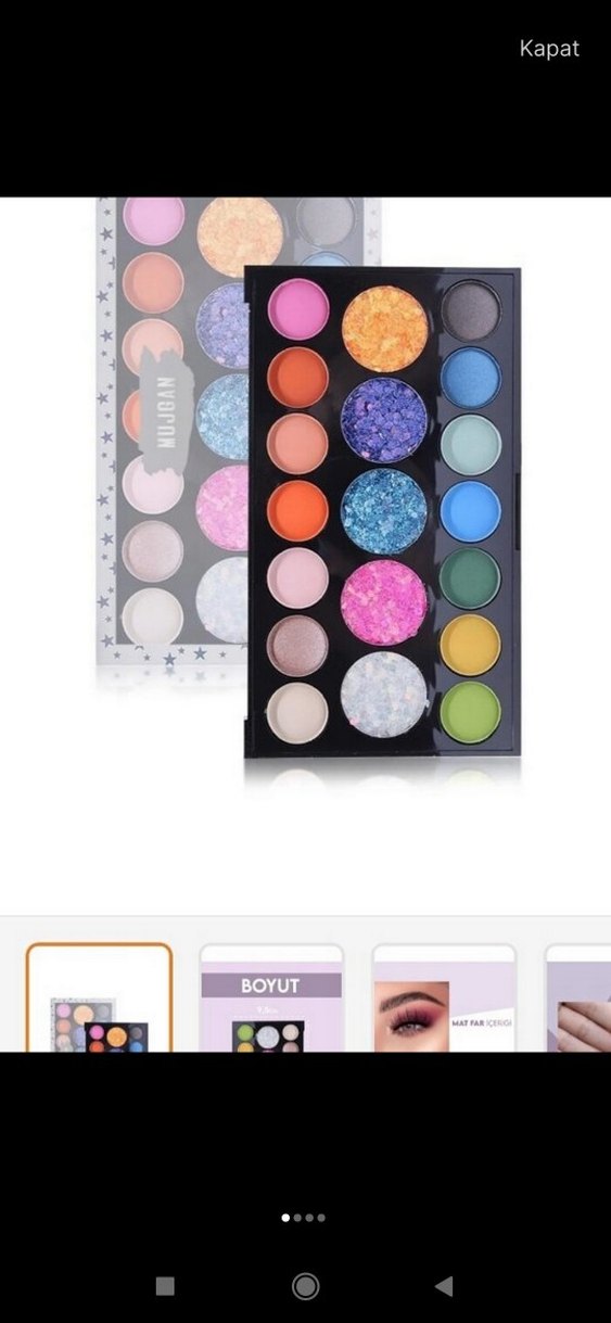 Çok renkli, ışıklı ve mat tonlardan oluşan göz farı paleti, çeşitli makyaj stilleri için uygundur.