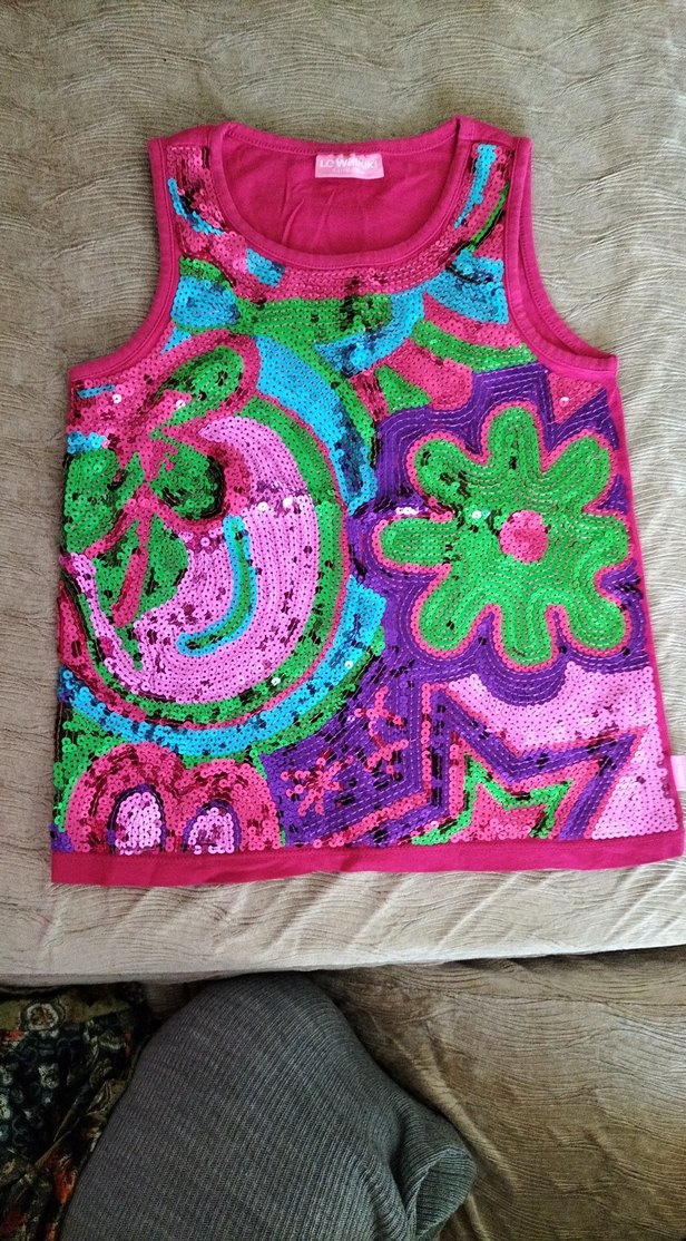 Kız çocukları için kolsuz, bol kesim bluz. Çok renkli işlemeli ve boncuk detaylı, pop kültür desenlerine sahip. Yuvarlak yakalı, bohem tarzda.