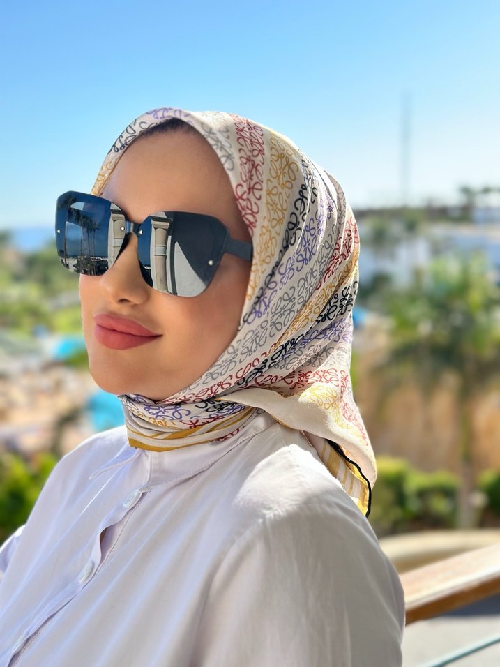 Hafif çok renkli desene sahip, drapeli kadın başörtüsü. Yumuşak sentetik kumaştan, mütevazı sokak modası tarzında.