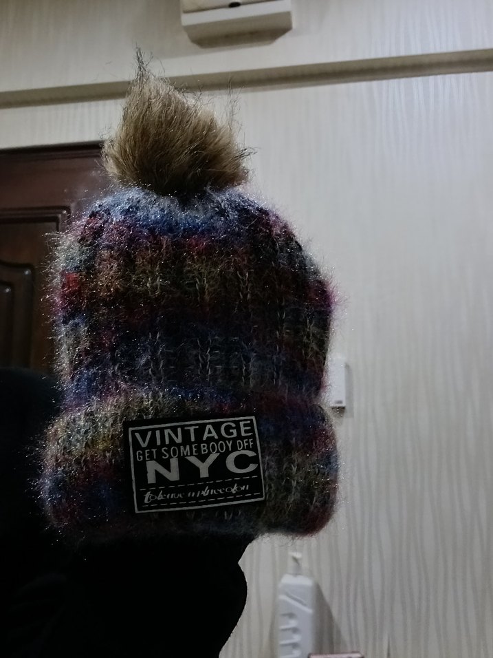Kadınlar için çok renkli, koyu tonlarda örgü bere, üstünde ponpon ve vintage NYC etiketi bulunur.