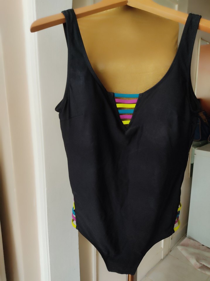 Kolsuz, vücuda oturan ve midi uzunlukta kadın mayo. Siyah ana renk ve yakada, yanlarda çok renkli çizgili detaylar bulunur. Velcro detayıyla athleisure ve sokak modası tarzını birleştirir.