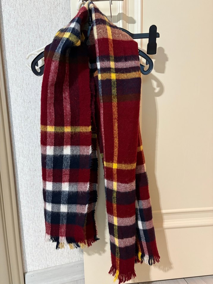 Koyu çok renkli ekose desene v kadın yün şalı, sıcak ve bohem bir görünüm sunar. Vintage tarzına uygun.