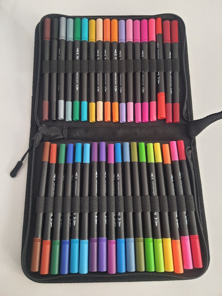Farklı koyu canlı renklerde kalemlerin fermuarlı kılıfta düzenli seti, renkli yazı ve çizimler için uygun. ✏️