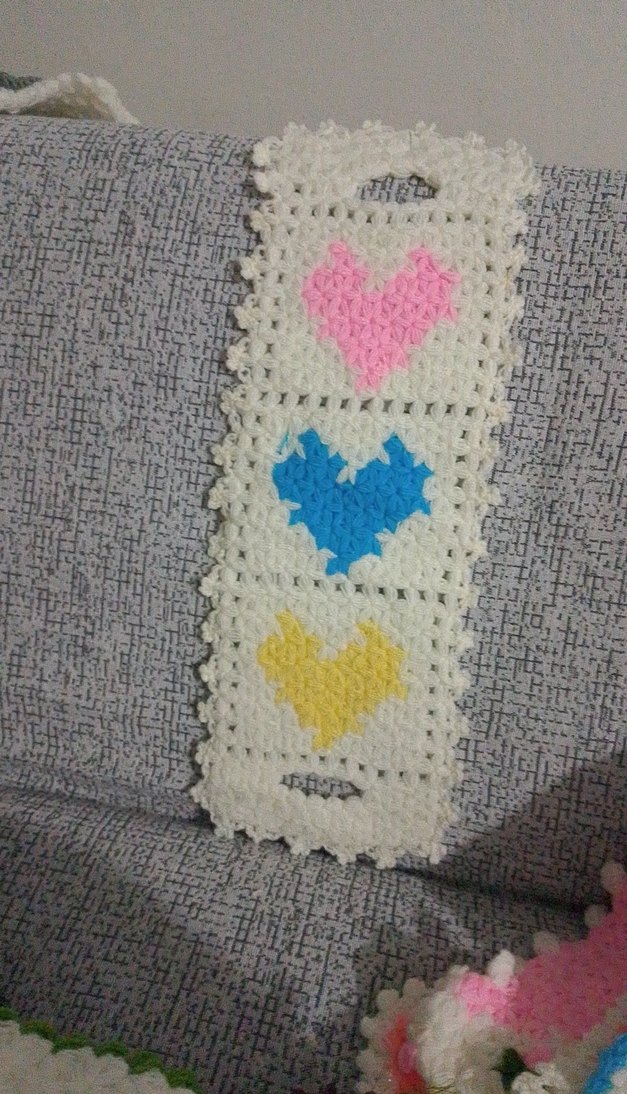 Pembe, mavi ve sarı kalp desenli beyaz tabanlı tığ işi banyo süngeri, nazik bir dokunuş sağlar.