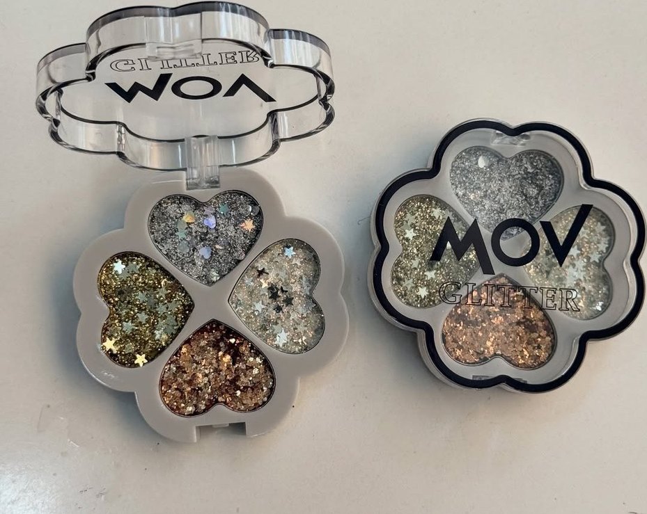 Dört kalp şeklinde bölmeli, gümüş, altın ve bronz tonlarda parıltılı çok renkli far paletidir. Şeffaf çiçek kapaklı kompakt tasarım.01,02,03,04