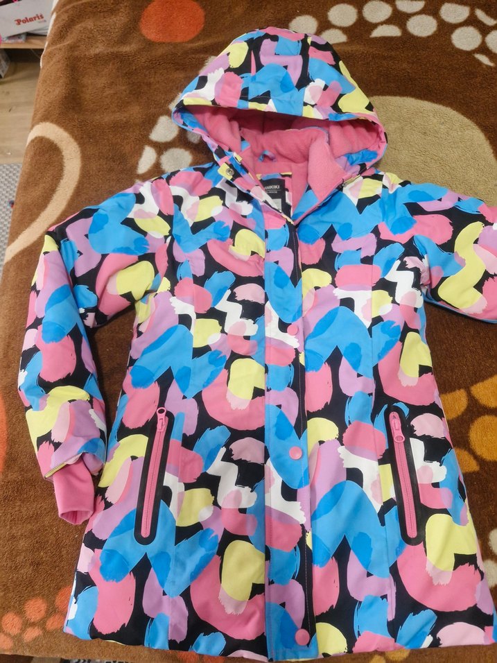 Renkli tie-dye desenli kapüşonlu kız montu, fermuarlı cepler ve rahat bol kesim ile sıcak ve yumuşak kumaştan yapılmıştır. sorunsuz az kullanildi