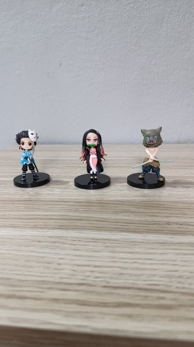 Demon Slayer Nezuko, Tanjiro, İnosuke stant ile beraber 7 cm boyunda, adet fiyatı 135 TL Çok renkli ve karanlık temalı bu aksiyon figürleri, detaylı karakterler ve aksesuarlarla birlikte siyah taban üzerinde durmaktadır.