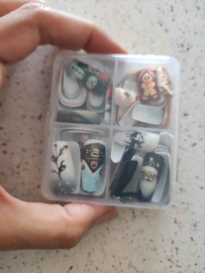 Çok renkli, karanlık temalı tırnak süslemeleri, çeşitli kış ve kutlama figürleriyle küçük bölmeli kutuda.