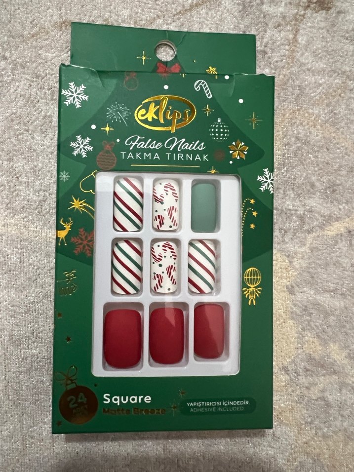 Çok renkli, kare şeklinde takma tırnaklar. Noel temalı ve düz renk desenleri bulunur. Yapıştırıcısı kutu içindedir.