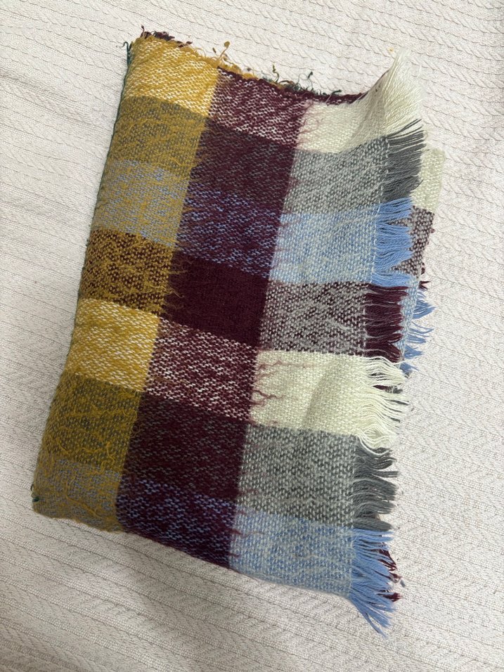 Kareli desenli, çok renkli ve koyu tonlarda, kenarları püsküllü yumuşak ve sıcak bir atkı